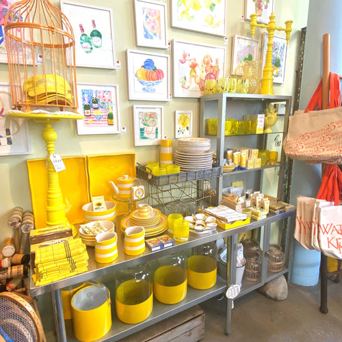 The goal is always to have wherever your eye lands be a visual feast. Even little tight shelves packed with personality. Here, my lemon yellow love continues. Stacks of Murano glasses, a happy bloom by Jeanne McKay Hartmann, a propped up oyster plate, and a bunch of salty Summer lemon goods. #Since1998 #PurveyorOfFineGoods At #WatsonKennedy™