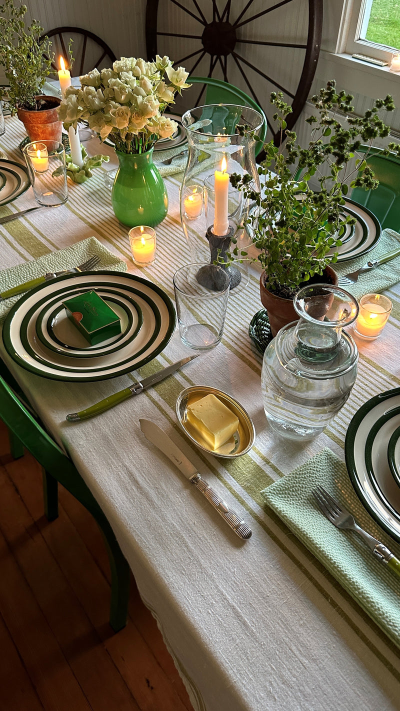 Old friends who used to live in Seattle that I have done business with for years & years moved away awhile ago. They happened to be in the Hudson Valley visiting so it was a perfect time to get together, catch up and break bread. The green striped Cornishware plates from England were called into action. Along with a new favorite glass we are just beginning to carry at WK, a clear perfectly simple tumbler. Tins of Louis Sherry truffles left at their place settings as little treats to remember the evening by. We had a big fire going on the back porch. It was so lovely to sit and start to catch up over a glass of wine. Lots of stories from our showroom days and finding out about new adventures.