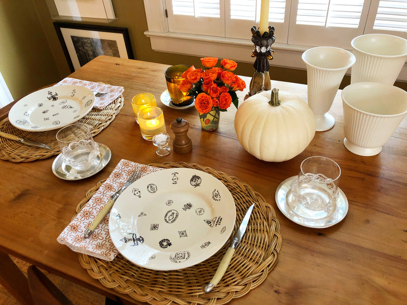 Our 1863 French fruitwood dining table is a workhorse. Case in point, yesterday as sat at it in the morning working away on paperwork for the shops after having breakfast sitting there. Then a quick lunch. I then shot a vignette for the upcoming book that was set on the table. Supper was roasted chicken breast and carrots nestled up next to a baked potato. The above a quick setting I put together for the meal. So the majority of the day I spent at the table. The orange roses in a Murano tumbler alongside a burning Trudon candle and new Henry Dean (more on these later) tealight vessels from Belgium kept me company all along the way. I love multipurpose furniture. It allows you to be creative in your living space so you end up enjoying every part of your home in a variety of ways.