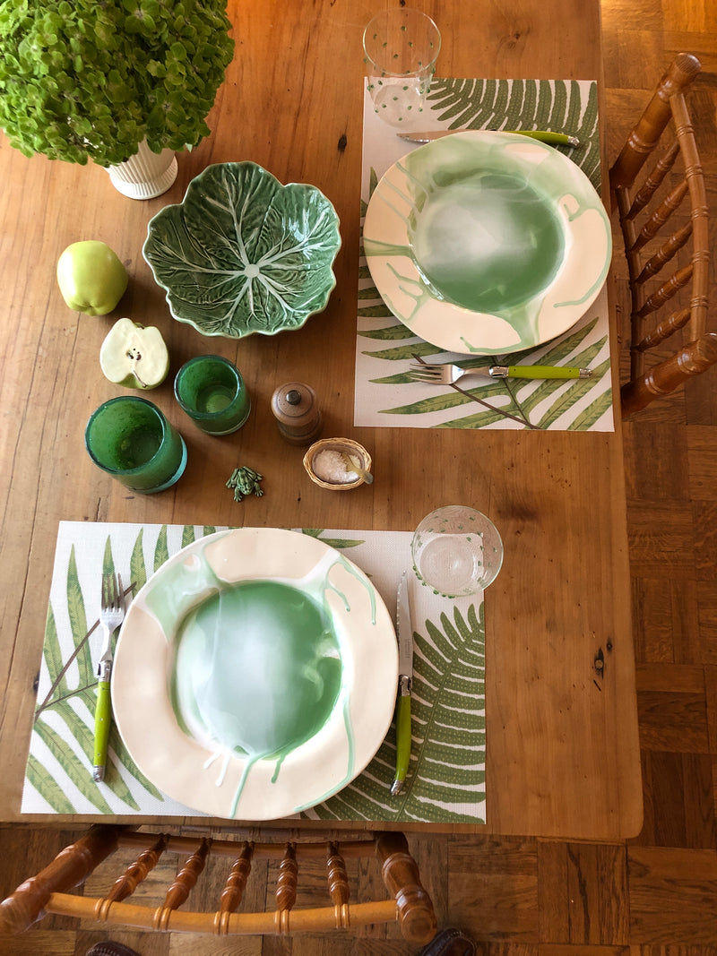 Green the prevailing theme for this table. Right down to the hydrangea. I like to set the table before we head out in the morning, that way it is all done when we arrive in the eve after a busy, full day. One thing less to do so we can concentrate on preparing the meal. Then it is a lovely, leisurely time at the table…