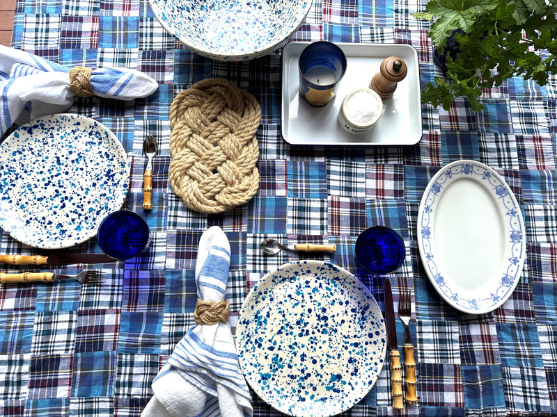 It has been an incredibly busy & full few months with the busiest and fullest ahead in the coming months. Our niece Aisling was visiting us from New York on a leg of a long work trip. She was staying with her sister Haley, so we thought a Sunday Supper would be a fun way to hang with them out on the island. Pizza is often on the menu when Haley comes to the house as she assists Mister Sive on the prep and cooking of it on the grill. We had fun picking up produce early Sunday morning at one of our favorite farm stands. It was a tad misty throughout the day so we pulled the dining table in and put it under the eaves. The lit lanterns would make it nice and cozy as we watched the boats and barges sail on by. The madras tablecloth I had made a few months ago I am still over the moon with and knew it might be the last of the season meals outside, so it was called into service. It has a bit of a ‘summer-y’ vibe to it, but that did not bother me one bit. It would be a happy table in all sorts of blues. As we savored the meal and the candles on the table and the hanging lanterns started to flicker as the sun went down, we gave much thanks for all being together.