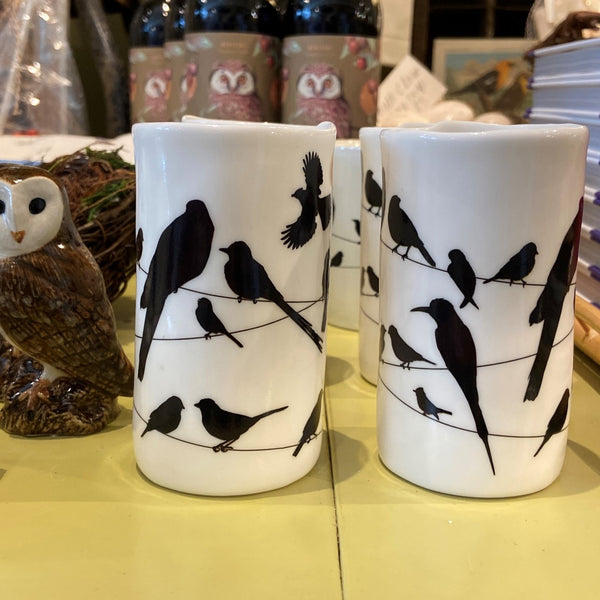 Light a candle and let it glow. Black and white birds perch in silhouette. Drop in a lit candle and be patient until the distinctive field marks and hues of 18 colorful species of Birds on a Wire are revealed. Tea candle not included, and approximately 4" deep, 2" diameter.
