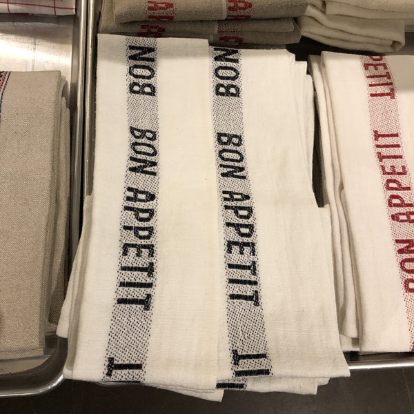 From France, these tea towels are heirloom quality linens. They are fantastic for dish or hand drying. Meant to be used and washed for many, many years. Beautiful Bon Appetite design makes that worthy of hanging in any kitchen!