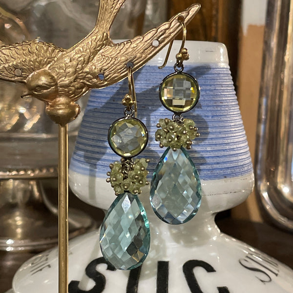 Highly faceted Lemon Citrine and Blue Quartz reflect and throw sparkle and shine from this beautiful pair; a substantial drop earring with wrapped crystal clusters that give interest to the eye. These gems have the palest hues, yet the visual impact is remarkable. A pair for a gala event or an evening outing in a crisp white button-down.