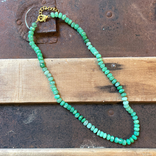 This strand of faceted Chrysoprase beads is full of variated apple green and turquoise-like cyan deep verdant hues ending with a 18k gold plated clasp. Knotted between each bead this 16" necklace has a nice weight and fall. This is a great layering piece.
