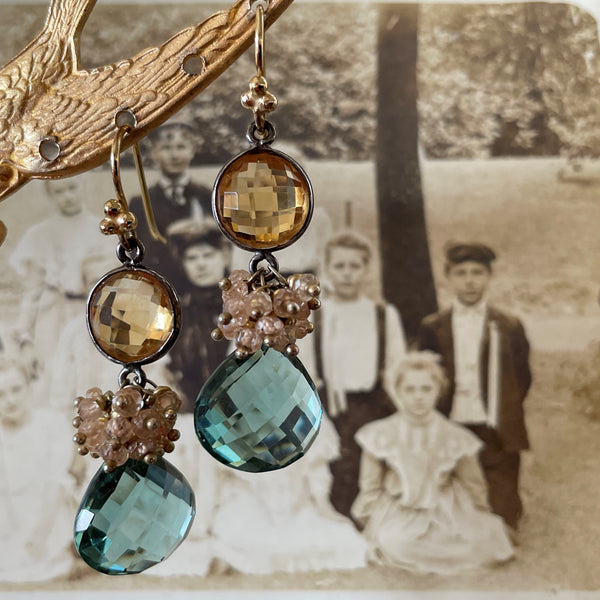 Faceted Citrine and a green quartz drop hang in a row with wrapped clusters of pink quartz separating the two. Optically delightful in a play of light, texture and colors.