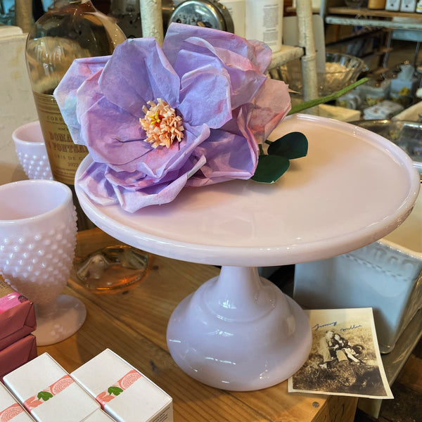 Add height when displaying hot or cold culinary delights on this footed 10"d. x 8" tall milky pink cake stand. Vintage retro design, sturdy enough to stack to create tiers for stylish entertaining dramatics. Handmade glass so hand wash only.