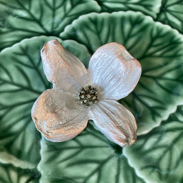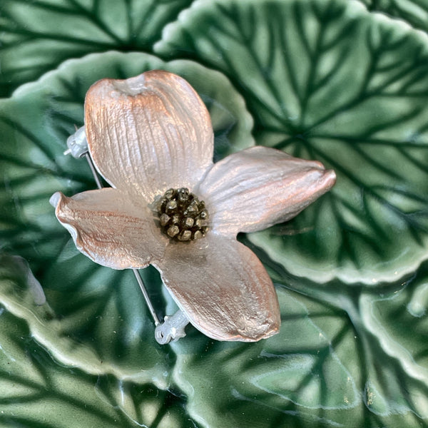 These unique pieces, like the Dogwood brooch, capture the beauty and exquisite detail of nature using soft patinas on bronze. Each piece is hand crafted and cast from the actual plant, using a technique similar to lost-wax casting. Attention to detail gives you true to nature, botanical jewelry - handmade in New York. Sterling silver stick pin back.