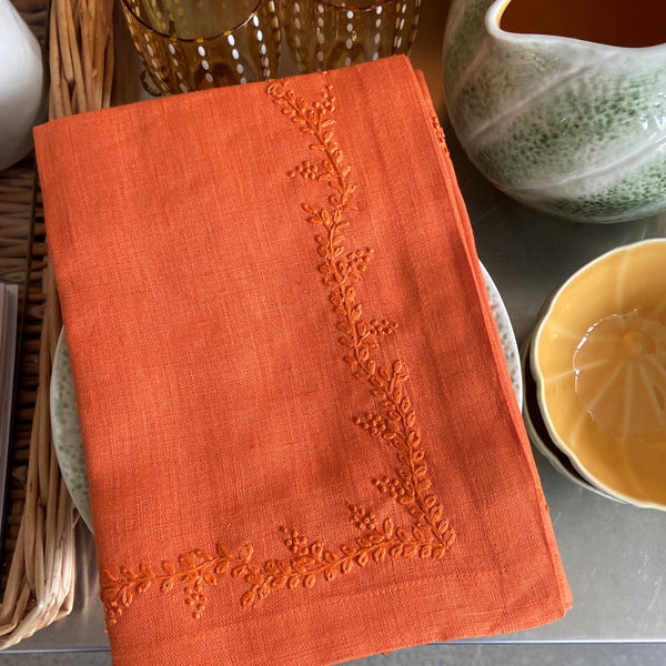 This Napkin Set in Orange Vine Design comes in the loveliest of colors. I absolutely adore the hand embroidered addition to each 20x20" dinner napkin. A special and natural touch to the dinner table. Pair with wood utensils for a truly earthy feel. Even with the delicate look, these napkins can be washed and dried on gentle/low.