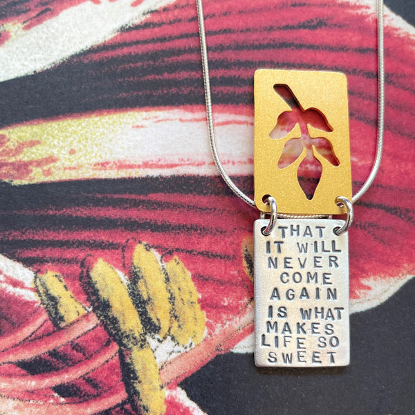 Kathy Bransfield jewelry shares history's most brilliant visionaries with you through her sterling silver and gold work. Each open to reveal hand-stamped quotes or icons that embrace faith in humanity and a belief in life's beauty and diversity. Many hold them as a sacred personal amulet evoking passionate responses from long time collectors and new fans alike. 16" Sterling silver and 22k gold plated brass.