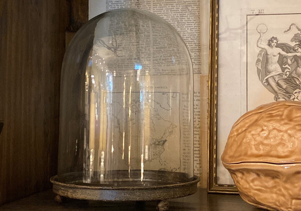 Cloche pieces are staples for someone who loves display and treasure items. Be it display candles in the store or objects at home, I love the addition of a glass cloche to a shelf. This one is stunning with the footed base.