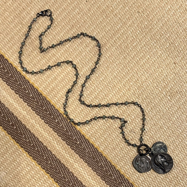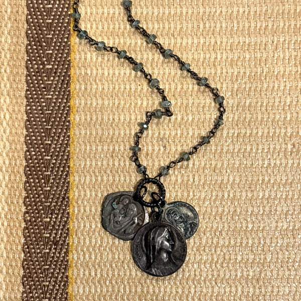 A pale translucent mint green variety of beryl, related to the emerald, 18" One-of-a-kind and hand-made from non-sacred antique medals found in French flea markets. Crafted with semi-precious beads and oxidized sterling silver. Each one unique and meaningful in symbolism in the selection of charms.