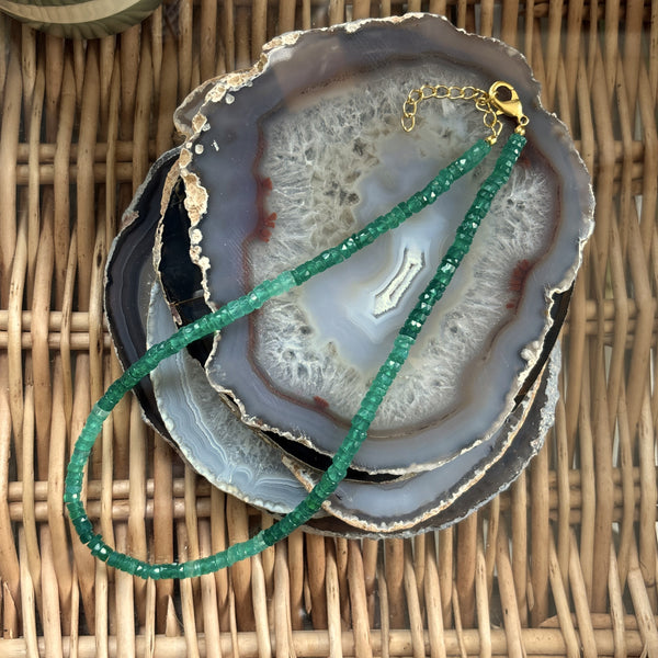 This strand of shimmery slightly faceted beads is full of variated verdant emerald greens ending with a 18k gold plated clasp. Knotted between each bead this 16" necklace has a nice weight and fall. This is a great layering piece.