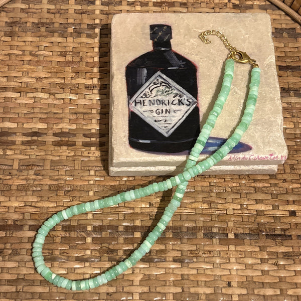 This strand of buttery green opal beads is full of variated hues ending in an 18k gold plated clasp with extender links. Knotted between each bead this 16" necklace has a nice weight and fall. This is a great layering piece.