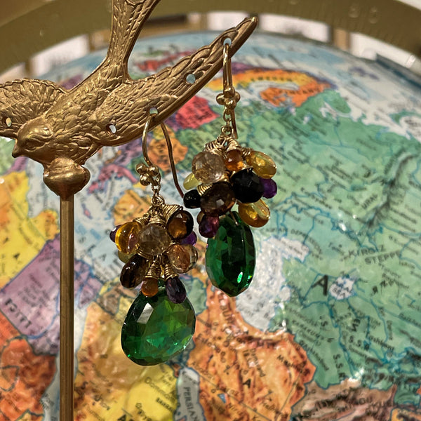 This chunky emerald-green quartz drop is capped with a mixed gem cluster of wrapped Spinel, Amethyst, Smokey Topaz, Citrine and Chalcedony. All hung on a GP ear wire. This is a statement pair exploding with deep autumnal jewel tones.