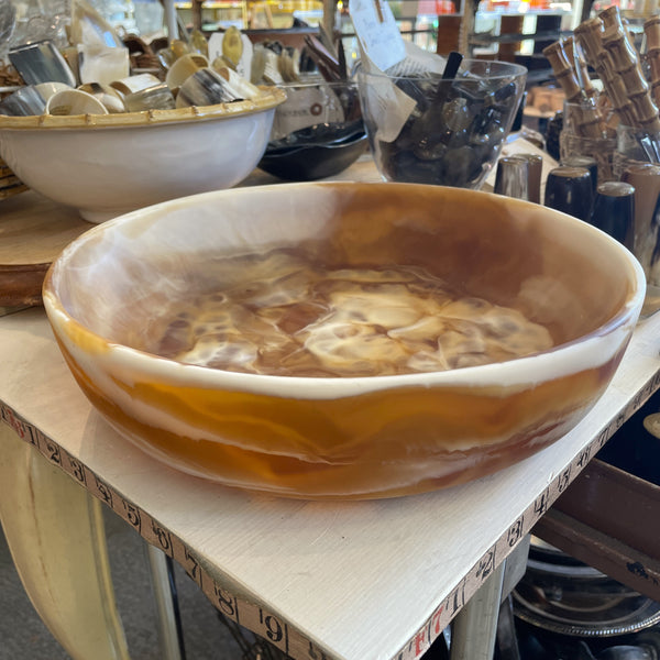 This generously sized marbled amber swirl bowl adds texture and character to the table or countertop. 13.5"d x 3" tall made of resin, not dishwasher or oven safe, hand wash only.