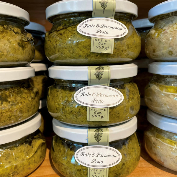 Kale & Parmesan Pesto is the newest addition to our line of all natural best-selling pestos. Use as a sauce for pasta, serve as a dip for fresh or roasted vegetables!