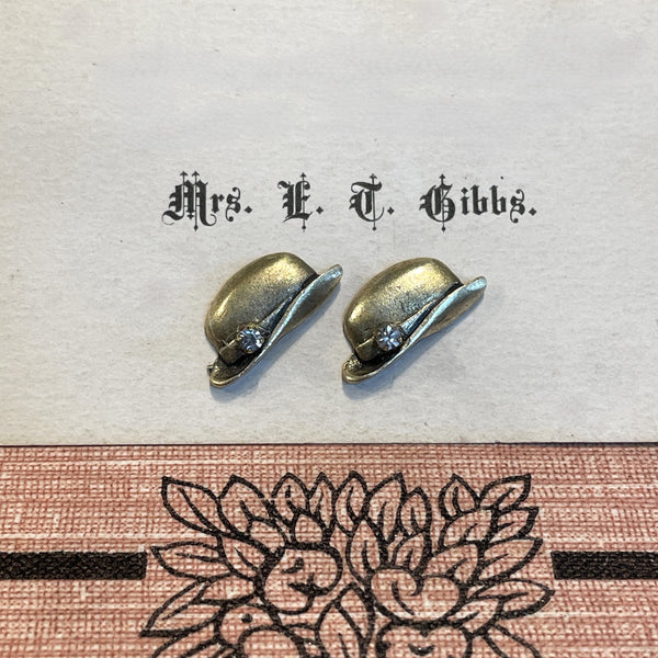 Unique combinations of vintage and modern elements crafted into timeless pieces. A charming vintage inspired antiqued gold plate bowler hat with rhinestone pop. Charmed, I'm sure!