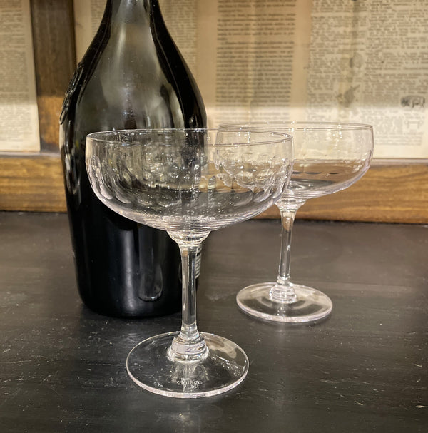 Inspired by 19th and early 20th century in design and feel, these jazz age coupes are hand blown, hand cut fine lead-free crystal, dishwasher safe. Tres chic in style with a band of connecting ovals. Tres chic in style and just the vessel in which to serve and enjoy bubbles or pretty craft cocktails.