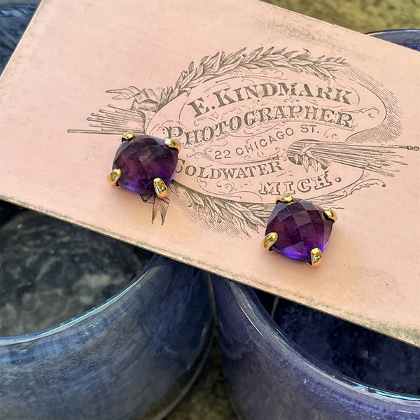 Lovely faceted semi-precious gemstones set in 14k gold vermeil prongs and posts. These are substantial squares that bring the burst of color, just right in simplicity and design. The deep midnight aubergine becomes translucent and full of color in the light. What better way to go from day to evening dress.