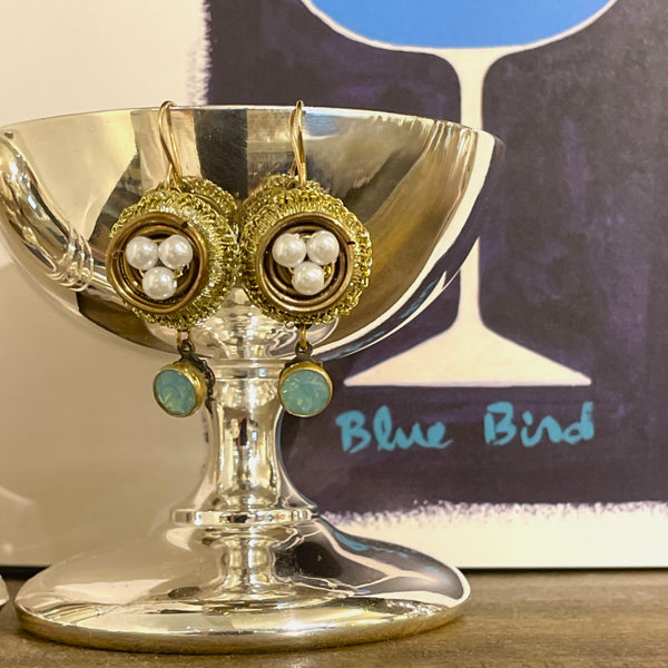 Unique combinations of vintage and modern elements crafted into timeless pieces. Wired nests with wee pearl eggs with a droplet of faceted iridescent mint hued glass hang 1.25" from the ear wire.