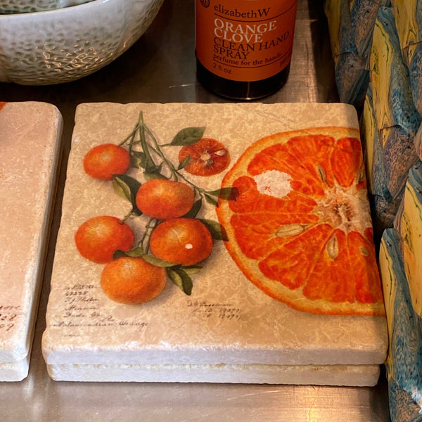 Love this tumbled marble coaster in orange botanical design. It measures 4×4? with marble top and cork base to keep any surface safe from spills and scratches. We love these coasters so much that we carry many designs.