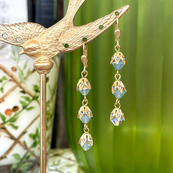 A sparkly cascading delight of 3 tiers of faceted Pacific opal blue Swarovski crystals capped off with 14k gold plated crowns with tiny crystal diamantes. All hanging from a French clasp. Such movement and dance in these sweet danglers.