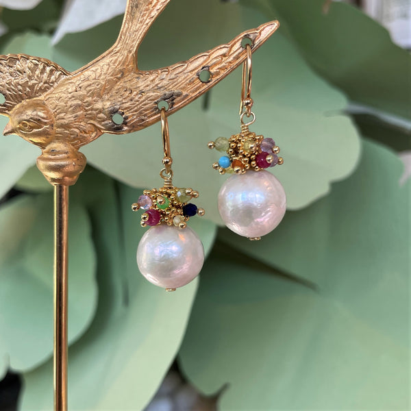 These half-inch weighty baroque pearls topped with a cluster of rainbow and gold beading keep the eye moving. A modern take on the classic pearl, this pair will go with any outfit of the day; then sweep your hair up into a chignon and off to the evening soiree. Baroque pearls have such depth and satin luster. So pretty.