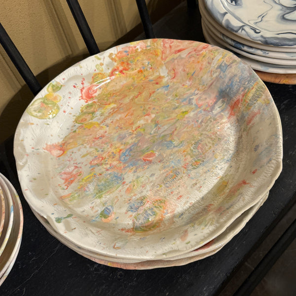 Each platter is one of a kind by Adrien Miller: Striving to make functional pottery that is exciting to look at. Making act of eating and drinking an art process in itself, revealing beauty as the food is consumed. Wanting functional pottery to offer a similar reward for one's attention that a work of art offers. Process driven, continuously trying new variations and exploring new colored clays. The surfaces highlight the process of moving from liquid to solid. Functional art that encapsulates a flow state.