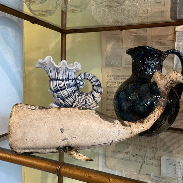 Thar-she-blows the white whale crafted from reclaimed metal, each one-of-a-kind featuring distressed Moby Dick era newsprint motif. Approx 12.5" long, stands 7" tall from fin to tail. Hollow bodied and easy for your nautical display.