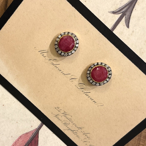 A faceted ruby red gemstone surrounded by tiny crystal rhinestones makes this pair so regal. A pair that seamlessly takes day to evening soiree especially when that pop of color makes all the difference. Tres chic!
