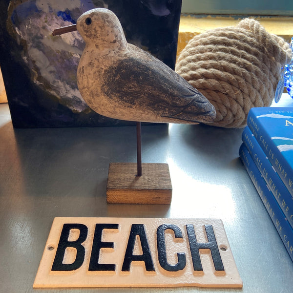 This wooden and metal seagull ornament will add a touch of sea-style to your home. sculpted from wood, with steel legs and a shabby chic neutral colouring. Great for a gift, or bringing the sea into your home and much less pesky than the real thing! Length 33cm x Width 10cm x Height 39cm. Lovely to adorn your book shelf or alone on a table.