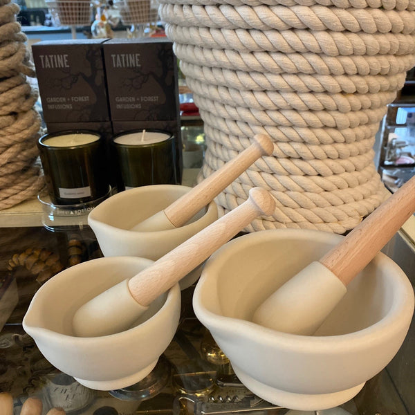 Dating back to early 20th century England, Milton Brook makes the best loved mortar & pestles. Made with the finest unglazed porcelain and beechwood handle.
