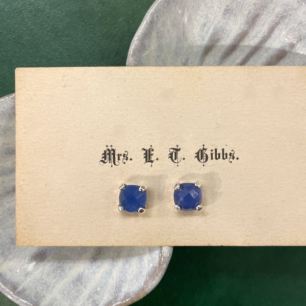 Small Four Prong Earrings, Royal Blue Chalcedony