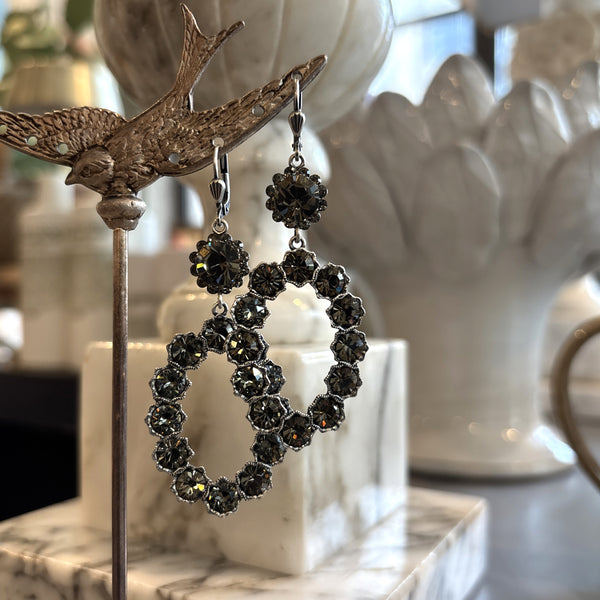 A contrast of silver with moody rhinestones hanging off of a large classic Swarovski crystal. A galaxy of stars for a starlet. At 2" a great length to add movement, sparkle shine to your favorite outfits. All hung from detailed French clasps.