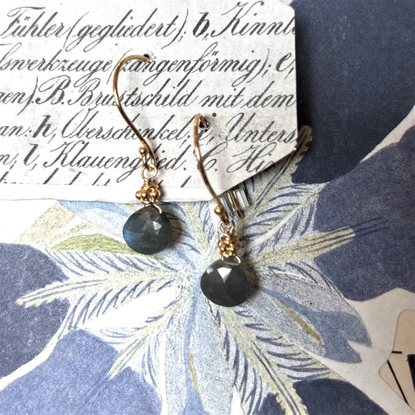 Tiny, faceted droplets of Labradorite with wee gold beaded wraps tying them to the gold ear wires. The color of this pair is dynamically throwing off all of the deep blue shades of the ocean.