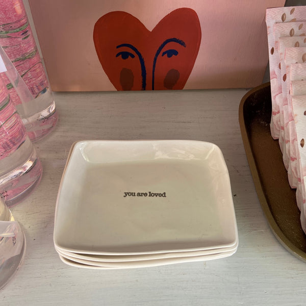 Right in time to share with the ones you love, this ceramic tray with You Are Loved design is so charming. Place it on a shelf to display, used on desk to collect your pens and office supplies, or leave it by your door as a place for keys, the dish really makes the best catch all. These are artist made porcelain pieces from Hudson, New York. We absolutely love carrying a variety of words and phrases on each piece. As they are hand-made yours is sure to be special in some one of a kind way.